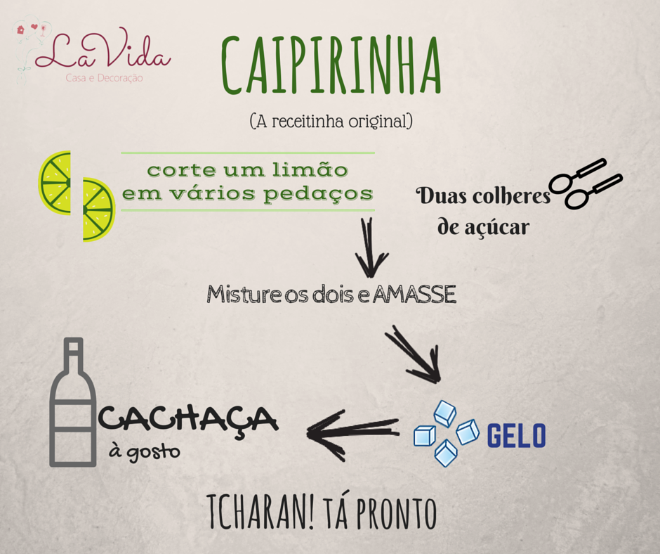 O drink mais popular do Brasil não podia ficar fora dessa! Dizem que a caipirinha surgiu a partir de uma receita de remédio caseiro, onde alguns ingredientes foram sendo substituídos e acabou virando o que é hoje. Logo abaixo colocamos a receita original da caipirinha, mas você pode soltar a imaginação e montar ela com várias frutas, substituir o álcool, fazer picolé…