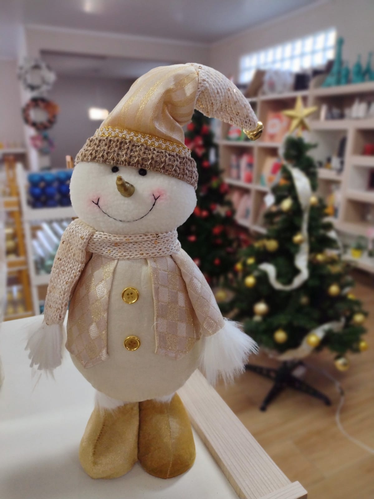 Boneco de “neve” em pelúcia todo cheio de detalhes em dourado. Uma fofura!