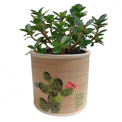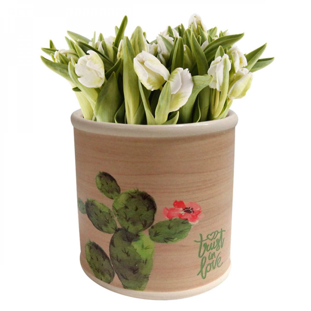 Cachepot fofo em cerâmica, com estampa de cacto, nas cores beje e verde.