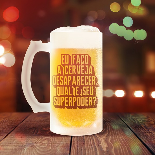 Caneca para chopp de material em vidro, com capacidade para 500 ml. Ela possui a divertida estampa “Eu faço a cerveja desaparecer. Qual é seu Superpoder?”, que é simplesmente perfeita para quem adora tomar uma gelada! 😀