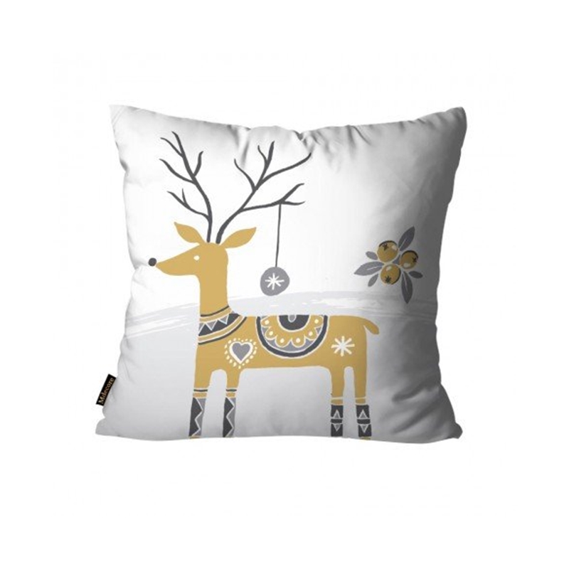 Capa para almofada estampada em tecido poliéster, com estampa super fofa de rena branca.