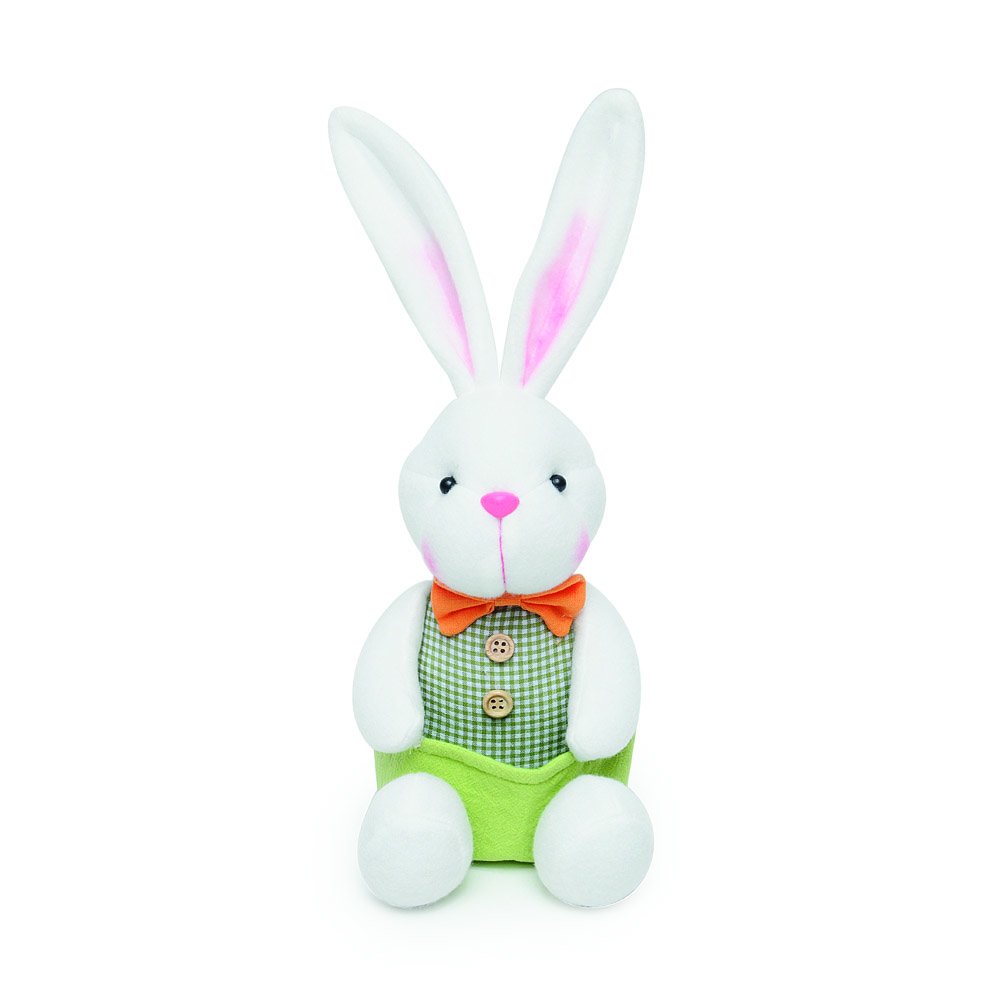 Coelhinho de Páscoa em pelúcia com detalhes em verde e laranja, na posição sentada.