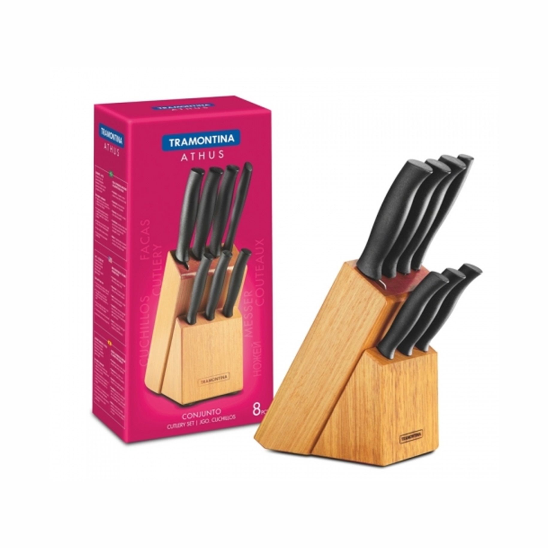 Conjunto de facas da linha Athus, da tramontina, contendo um suporte de madeira natural, um garfo trinchante e 6 facas: faca para legumes e frutas, faca para churrasco, faca para tomate, faca para pão, faca de cozinha e faca para carne.