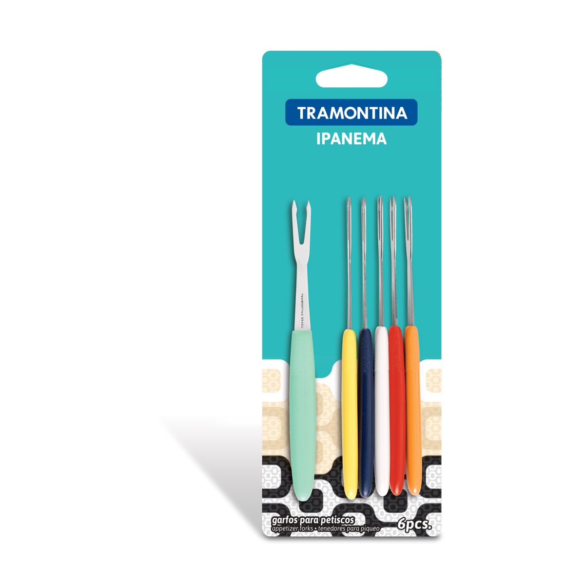Kit com 6 garfinhos para petisco da linha Ipanema, da Tramontina, com cabos em plástico e lâminas em aço inox.