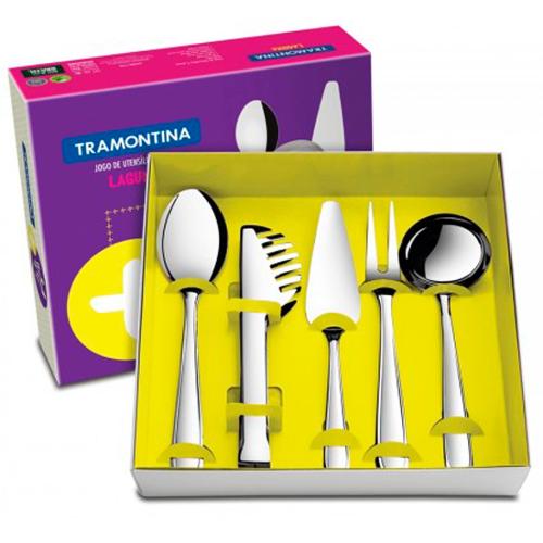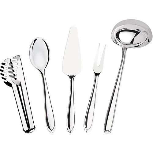 Jogo de utensílios em aço inox, contendo 5 peças: 1 pá para bolo, 1 colher para arroz, 1 pegador para massa, 1 garfo trinchante para carne, 1 concha para feijão. É super versátil e muito útil!