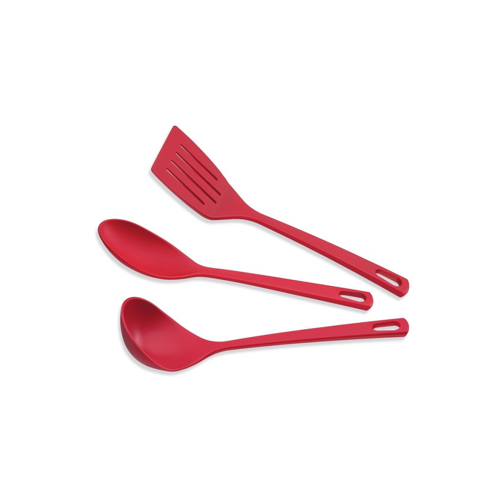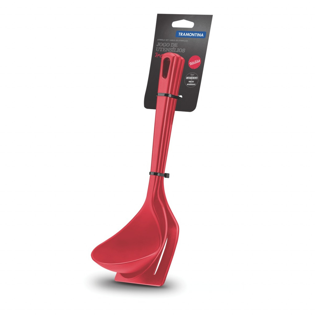 Kit de utensílios em Nylon, da Tramontina, contendo 3 peças: 1 espátula; 1 colher para arroz e 1 concha.