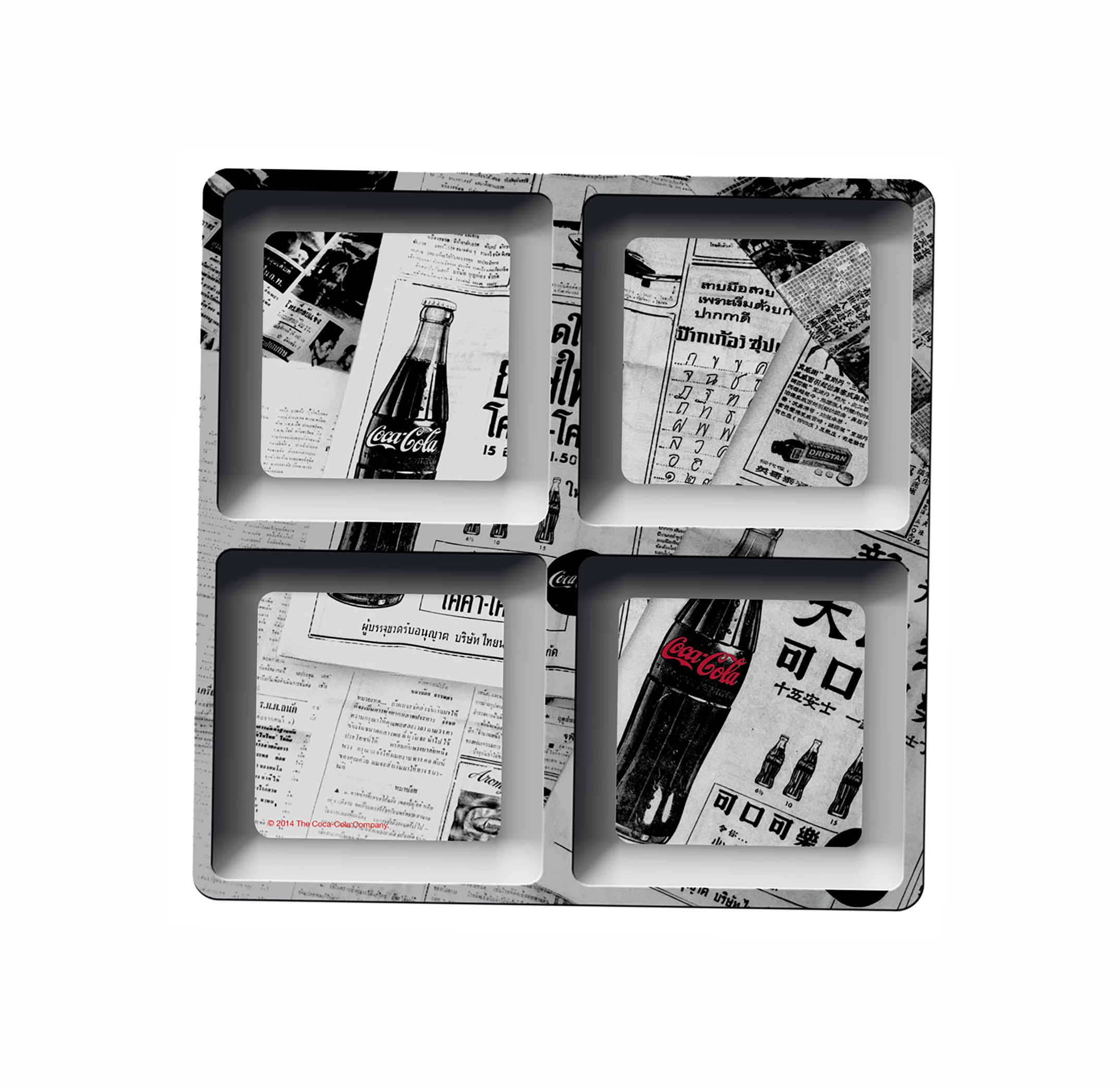Petisqueira Coca-Cola quadrada em preto e branco, super estilosa! Contém quatro compartimentos para colocar um monte de petiscos deliciosos quando receber a galera em casa.