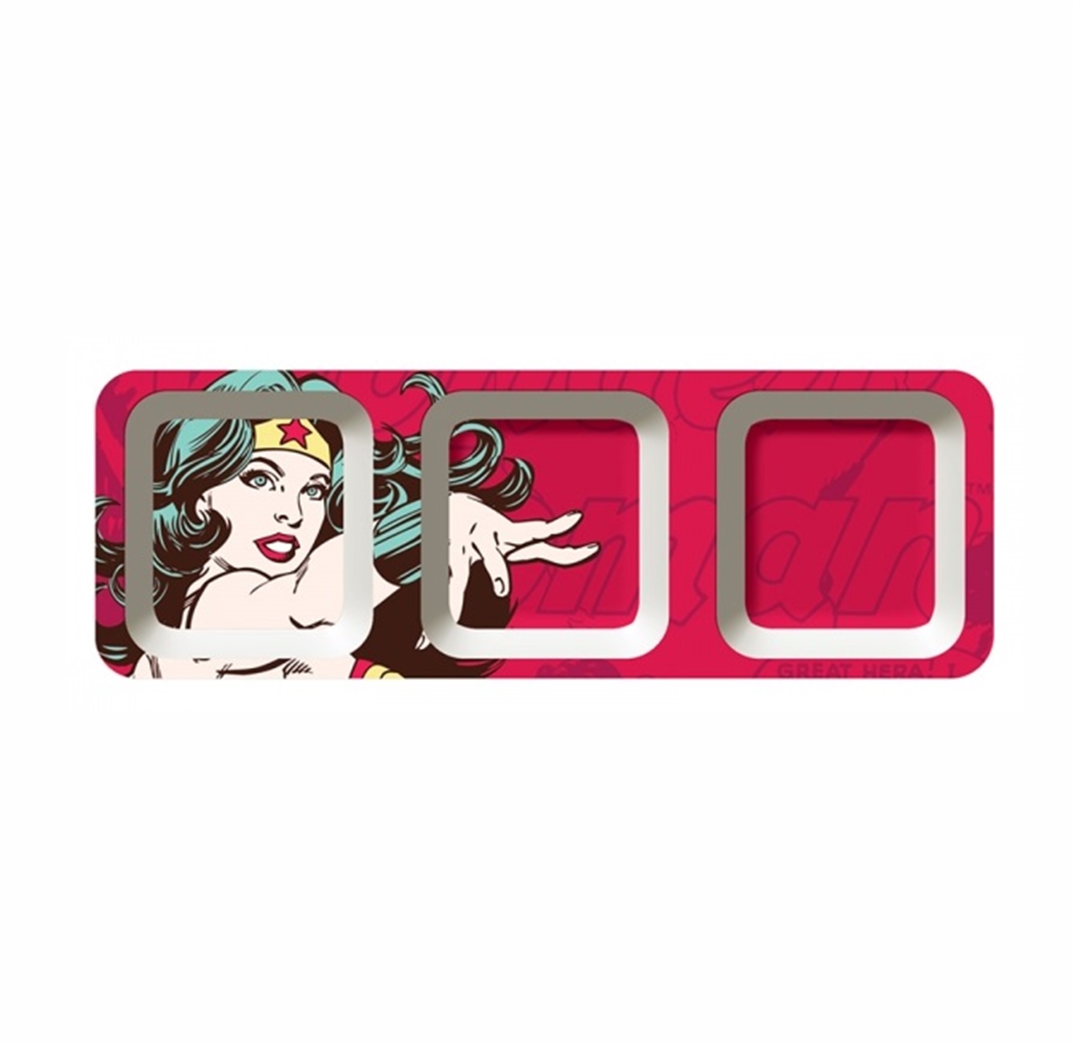 Petisqueira com tema da Mulher Maravilha, em plástico e super estilosa! Contém três compartimentos para colocar um monte de petiscos deliciosos quando receber a galera em casa.