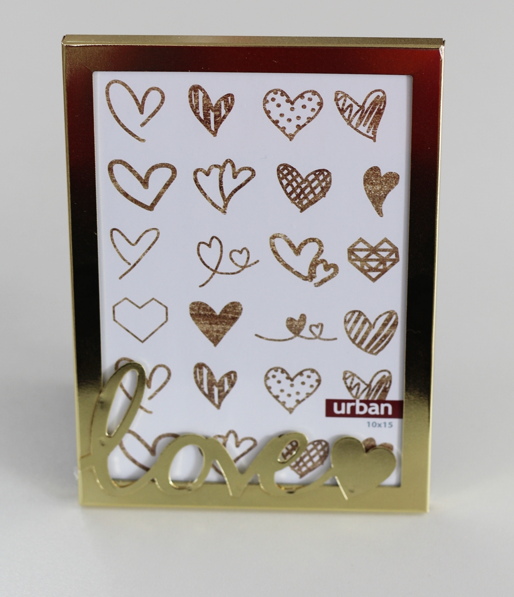 Porta retrato em metal, na cor dourada, com a palavra “Love” como adorno na frente.