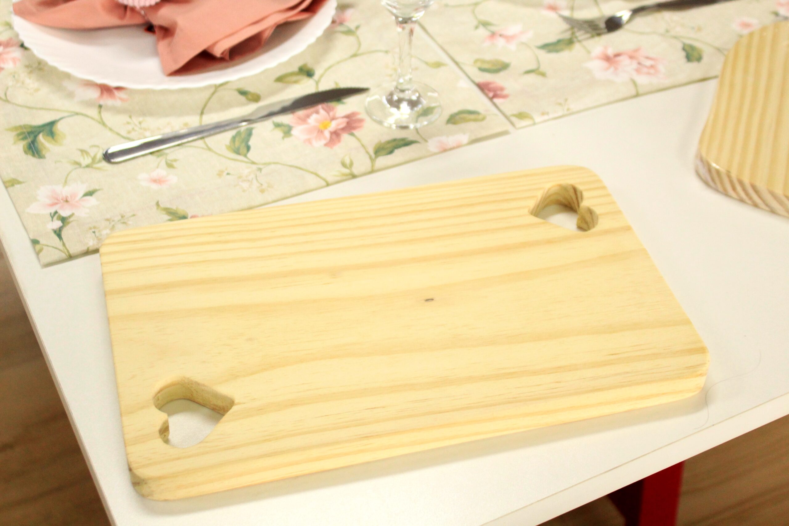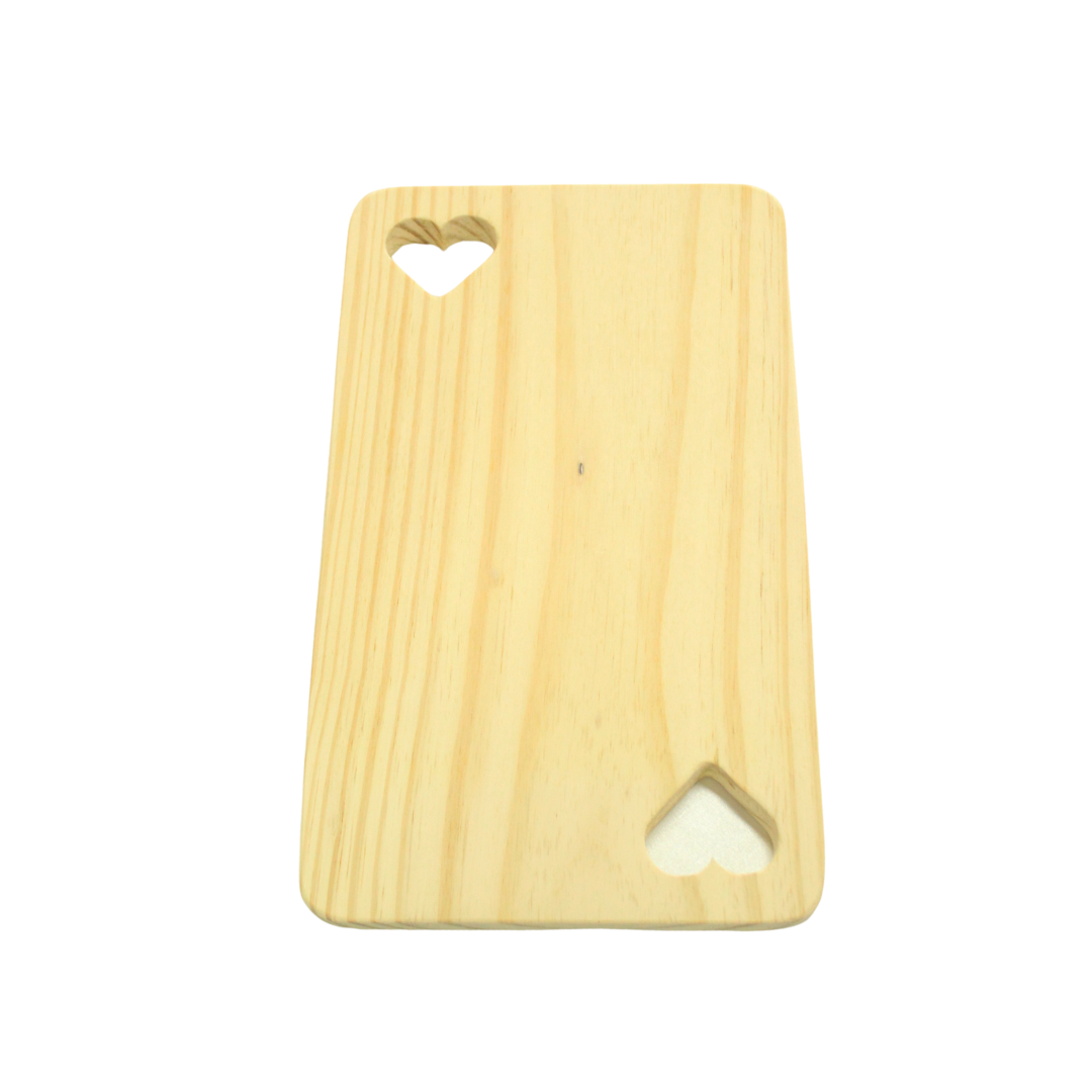 Tábua em madeira de Pinus em formato retangular, com detalhe de dois corações nas pontas.