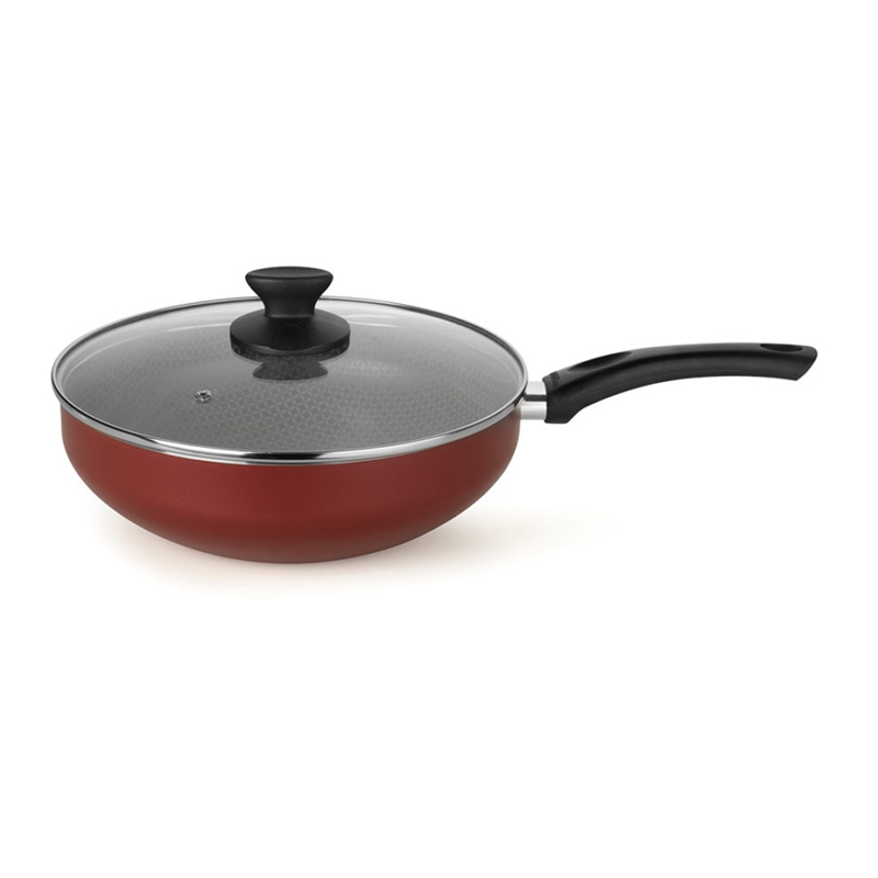 Panela wok na cor paprika (vermelha), com 28cm de diâmetro. Ela acompanha uma tampa de vidro e é feita em alumínio com tecnologia antiaderente, ou seja; nada de coisas grudando!